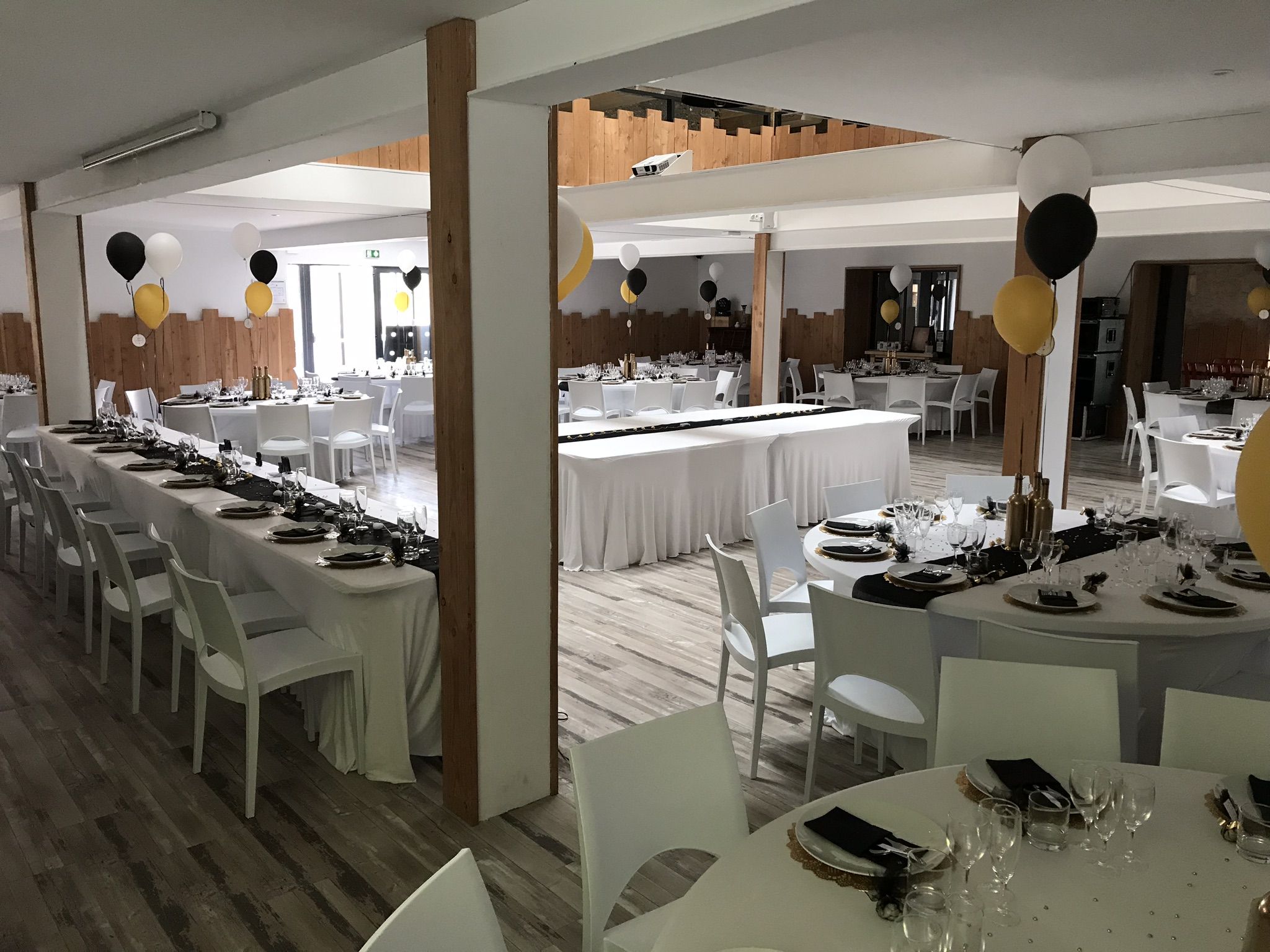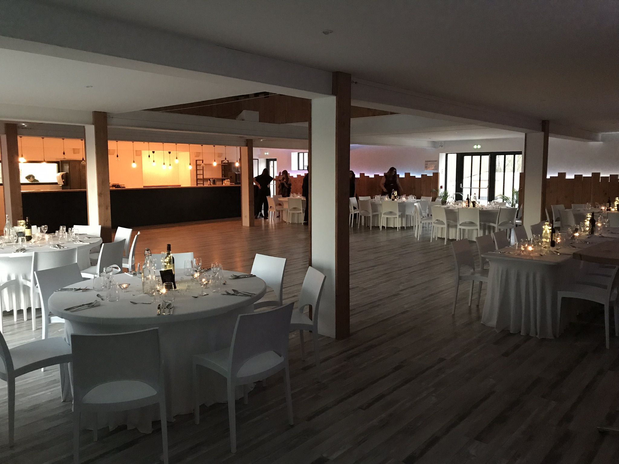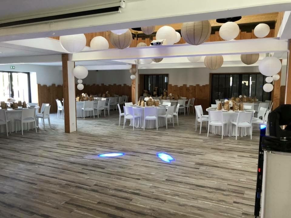 Salle de 200m² pouvant accueillir jusqu'à 200 pers. équipée d'un vidéoprojecteur, d'une régie technique (son - jeux de lumière - micro), de mobiliers (tables rondes et rectangles), de chaises blanches et d'un éclairage d’ambiance par lumières indirectes.